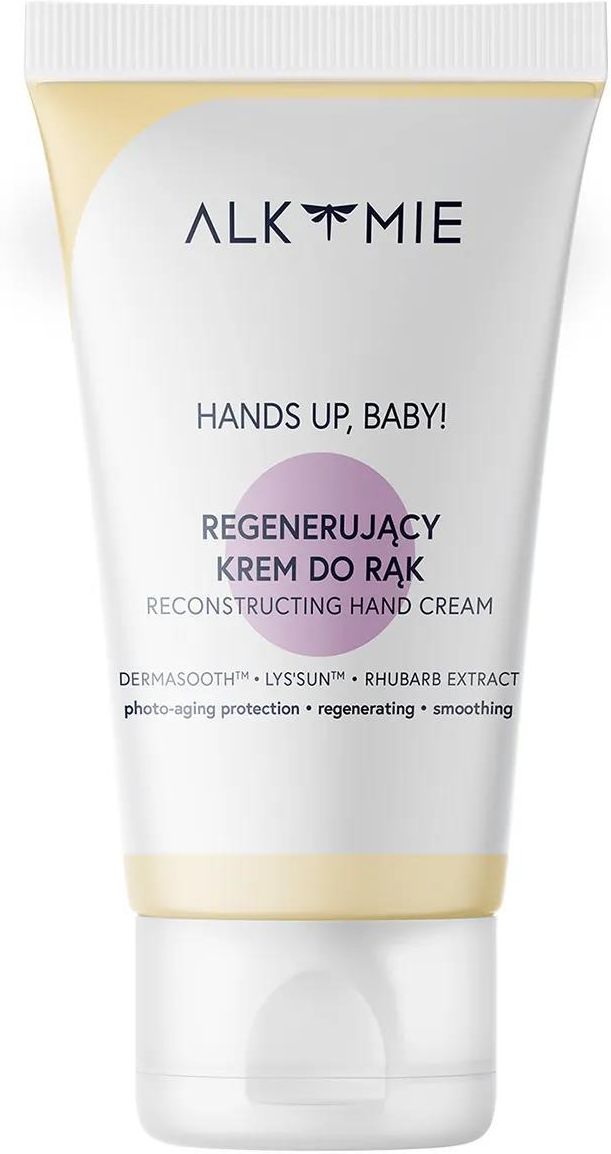 Alkmie Hands Up Baby Regenerujący krem do rąkHands up, baby! to regenerujący krem do dłoni niwelujący skutki fotostarzenia i proces degradacji skóry.Skutecznie wspomaga skórę dłoni w walce z suchością i utratą jędrności.Zapewnia natychmiastowe uczucie ukojenia.Intensywnie nawilża, wycisza zaczerwienienie oraz reakcje zapalne.Benefity:ujędrnienie i wygładzenieintensywna regeneracjaochrona przed fotostarzeniemSkuteczne rozwiązanie dla skóry:suchejpodrażnionejpozbawionej jędrnościEfekt natychmi