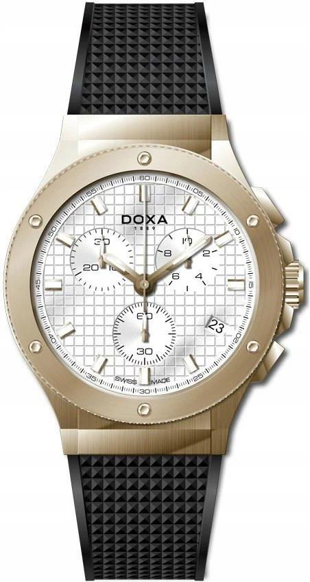Zegarek męski Doxa D-Sport Chronograph 166.90.011.20 Szwajcarski zegarek Doxa sygnowany Swiss Made na tarczy Wskaźnik wyczerpania baterii EOL Tarcza wykończona giloszowaniem Wśród funkcji datownik i chronograf Powłoka luminescencyjna na wskazówkach i indeksach Wymiary zegarka: Szerokość koperty: …