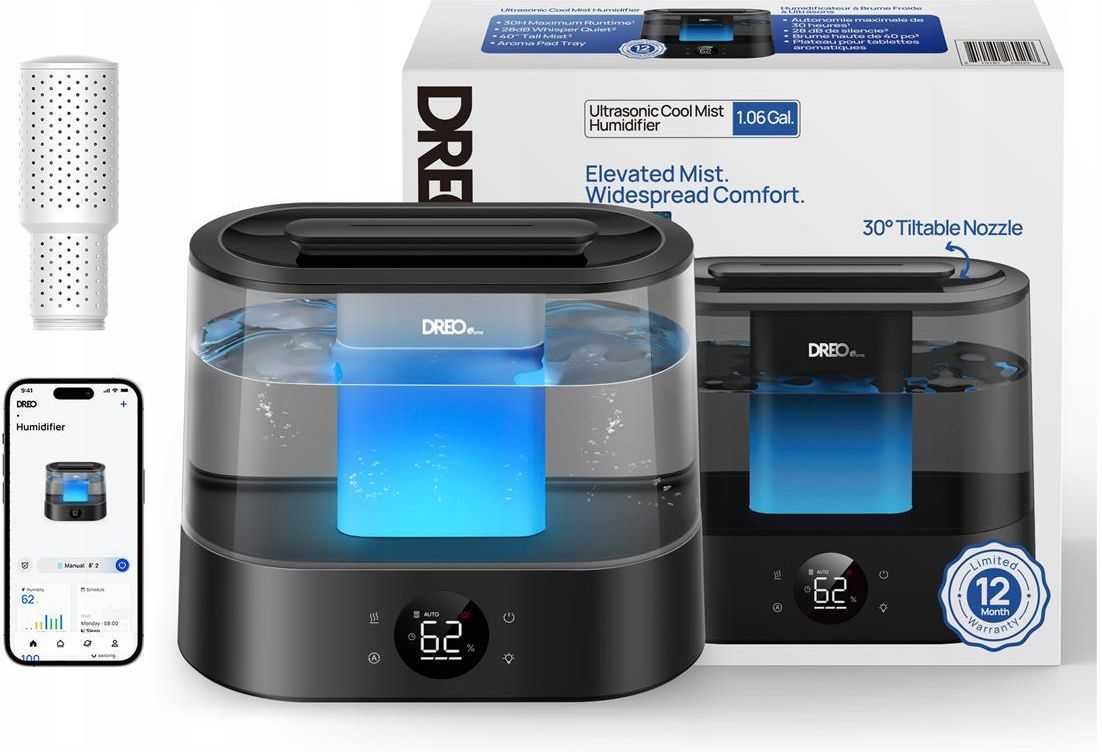 DREO Nawilżacz Powietrza Dyfuzor Zapachowy Aromaterapia Na Olejek 4L Cichy Producent: DREO Kod Produktu: DR-HHM010S Specyfikacja Producent: Dreo Model: HM420S Kod produktu: DR-HHM010S Napięcie wejściowe: AC 220-240V, 50-60 Hz Moc znamionowa: 28 W Pojemność zbiornika na wodę: 4l Maksymalny czas pracy: do 40 godzin (przy minimalnym poziomie mgiełki) Wysokość mgiełki: do 100 cm Szerokość strumienia pary: 10 cm Wielkość cząsteczek pary: 5 µm Częstotliwość ultradźwięków: 2,4 MHz Prędkość obrotowa wentylatora: 3900 obr./min Poziom hałasu: 28 dB (tryb cichy) Tryby pracy: Auto / Manual / Sleep Sterowanie: Aplikacja mobilna Dreo + Sterowanie głosowe Czujnik wilgotności: Dokładność ±5% Aromaterapia: możliwość użycia olejków eterycznych Kompatybilność z filtrami: Tak – obsługuje filtry odkamieniające i czyszczące W zestawie nawilżacz powietrza wkład na olejek eteryczny szczoteczka do czyszczenia instrukcja obsługi Największe zalety Wydajne nawilżanie do 40 godzin – zbiornik 4 l i technologia MistWave™ zapewniają równomierne rozprowadzanie pary. Cicha praca 28 dB – idealny do sypialni, pokoju dziecka i biura. Automatyczna regulacja wilgotności – czujnik z dokładnością ±5% i tryb Auto Mode utrzymują optymalne warunki. Sterowanie aplikacją i głosem – obsługa przez aplikację Dreo i kompatybilność z asystentami głosowymi. Funkcja aromaterapii i bezpieczna konstrukcja – możliwość dodania olejków eterycznych oraz system antyprzeciekowy. Nawilżacz powietrza 4L Dreo HM420S Dreo HM420S to ultradźwiękowy nawilżacz powietrza o pojemności 4 litrów, który łączy dużą wydajność, cichą pracę i inteligentne funkcje sterowania. Został zaprojektowany z myślą o zapewnieniu komfortu w pomieszczeniach średniej wielkości, bez konieczności częstego uzupełniania wody. Zautomatyzowane działanie, precyzyjna kontrola poziomu wilgotności i możliwość obsługi za pomocą aplikacji sprawiają, że to urządzenie dostosowuje się do rytmu Twojego dnia. Wydajne nawilżanie z długim czasem pracy Zbiornik o pojemności 4l zapewnia aż do 30–40 godzin ciągłego działania bez konieczności dolewania wody. Nawilżacz wytwarza ultradrobne cząsteczki pary o wielkości zaledwie 5 mikrometrów, co pozwala szybko i równomiernie zwiększyć wilgotność w pomieszczeniu. Dzięki technologii MistWave™ para unosi się na wysokość ok. 100 cm, co skutecznie nawilża całe wnętrze, a szerokość rozpylania na ok. 10 cm zapewnia równomierne pokrycie przestrzeni. Cicha praca Dzięki zastosowaniu silnika o prędkości 3900 obrotów na minutę urządzenie działa niezwykle cicho. Z maksymalnym poziomem hałasu 28 dB, HM420S nie przeszkadza w pracy, odpoczynku ani śnie. To idealne rozwiązanie do sypialni, pokoju dziecka lub domowego biura, gdzie ważna jest cisza i spokój. Precyzyjna kontrola poziomu wilgotności Wbudowany czujnik wilgotności o dokładności ±5% na bieżąco monitoruje warunki w pomieszczeniu i automatycznie dostosowuje intensywność pracy nawilżacza. Dzięki temu urządzenie utrzymuje optymalny poziom wilgotności bez konieczności ręcznej regulacji. Tryb Auto Mode sprawia, że Dreo HM420S staje się praktycznie bezobsługowy, dbając o zdrowy klimat w domu przez całą dobę. Pełna kontrola z dowolnego miejsca Nawilżacz jest kompatybilny z asystentami głosowymi i umożliwia pełne sterowanie przez aplikację mobilną DREO. Możesz ustawić harmonogram, zmienić tryb pracy, sprawdzić poziom wilgotności w czasie rzeczywistym, a nawet włączyć funkcję aromaterapii. Bezpieczna konstrukcja Urządzenie zostało zaprojektowane z myślą o prostocie obsługi i trwałości. Konstrukcja typu top-fill umożliwia wygodne uzupełnianie wody bez rozlewania. Zastosowane rozwiązania chronią elektronikę przed wilgocią – wewnętrzne komponenty mają specjalne powłoki ochronne, a zasilanie zostało odizolowane od zbiornika wody. Dodatkowo specjalna struktura antyprzeciekowa zapobiega wyciekom i przypadkowemu zalaniu elementów elektronicznych. Funkcja aromaterapii i kompatybilność z wkładami odkamieniającymi Dreo HM420S pozwala na stosowanie olejków eterycznych, co nie tylko poprawia jakość powietrza, ale i tworzy przyjemną atmosferę w pomieszczeniu. Urządzenie współpracuje również z wkładami odkamieniającymi, co przedłuża jego żywotność i pozwala utrzymać jakość wydobywającej się mgiełki przez dłuższy czas.