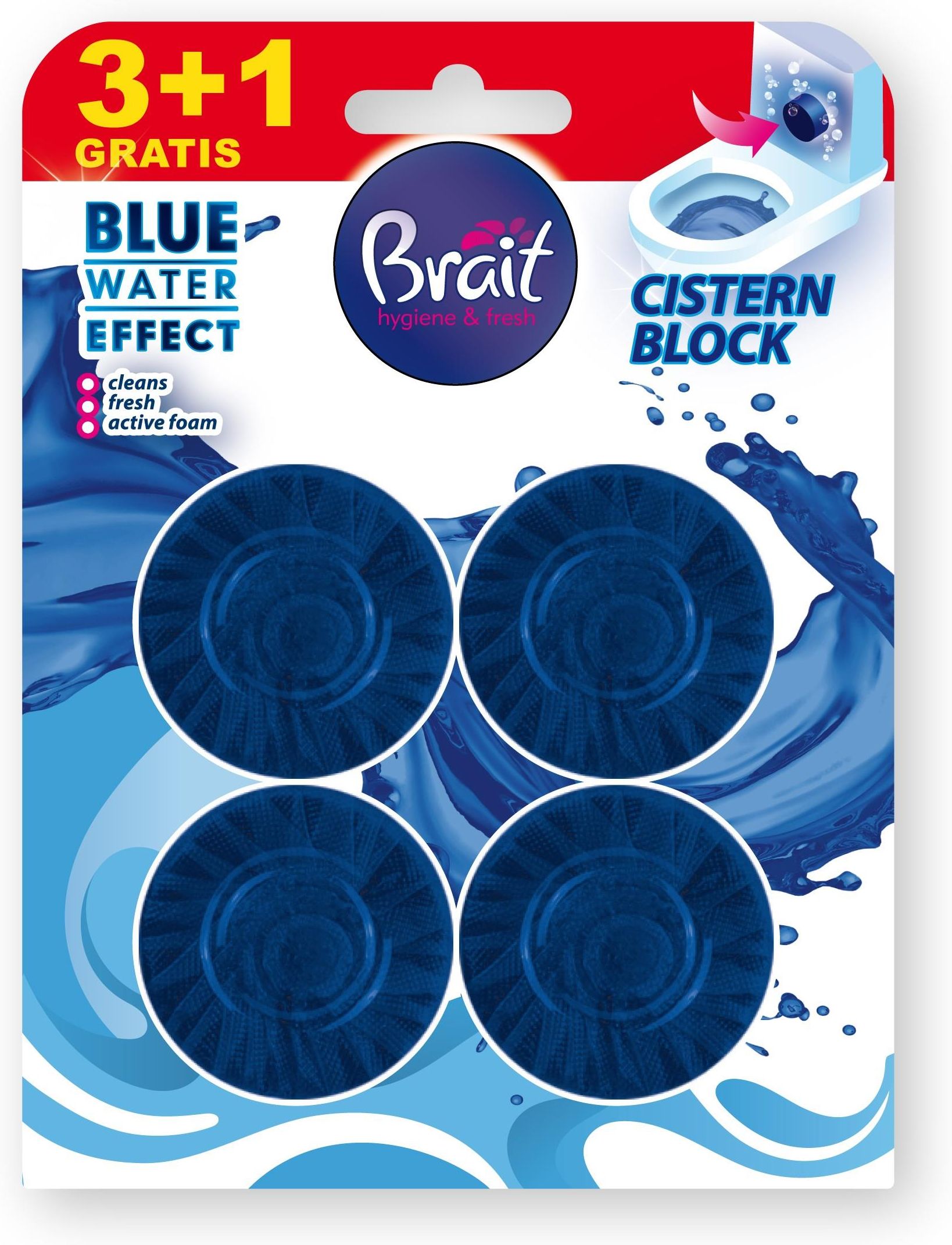 BRAIT Blue Water Effect Krążek do WC Niebieski 4 x 50 g Odkryj niezawodny sposób na utrzymanie toalety w czystości i świeżości z BRAIT Blue Water Effect. Nasze krążki do WC to idealne rozwiązanie dla Ciebie i Twojej rodziny, które skutecznie wspierają codzienną higienę. Dzięki aktywnym składnikom, krążki Brait zapobiegają odkładaniu się kamienia na powierzchni muszli, co sprawia, że Twoja toaleta będzie wyglądać jak nowa przez dłuższy czas. Po każdym spłukaniu, krążek Brait wypełni muszlę obfitą pianą oraz zabarwi wodę na piękny, niebieski kolor, który nie tylko estetycznie wygląda, ale także podkreśla efekty jego działania. To proste i skuteczne rozwiązanie, które z pewnością doceni każdy domownik. Dlaczego warto wybrać BRAIT Blue Water Effect? Efektywne zapobieganie osadzaniu się kamienia. Przyjemny zapach, który utrzymuje świeżość w toalecie. Łatwe w użyciu – wystarczy wrzucić do spłuczki. Estetyczny efekt barwienia wody, który zachwyci wszystkich domowników. Sposób użycia Wystarczy wrzucić krążek do spłuczki, a resztą zajmie się Brait. Ciesz się czystością i świeżością w swojej toalecie bez zbędnego wysiłku! Skład 30% i więcej anionowe środki powierzchniowo czynne; mniej niż 5% niejonowe środki powierzchniowo czynne, kompozycje zapachowe, Coumarin. Wybierz BRAIT Blue Water Effect i przekonaj się, jak łatwo można zadbać o czystość i świeżość w Twojej toalecie!
