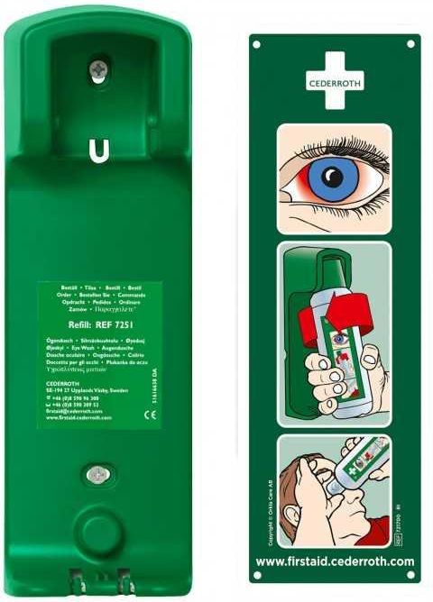 Uchwyt ścienny na płukankę do oczu Cederroth 7200 to solidne i praktyczne rozwiązanie do przechowywania płukanek Cederroth o pojemności 500 ml. Butelka pozostaje zatrzaśnięta w uchwycie, a wyjęcie jej z niego powoduje jej automatyczne otwarcie - natychmiast można rozpocząć płukanie oka. Można ją wstawić na kilka różnych sposobów i dlatego pasuje na każdym stanowisku pracy i w każdym pomieszczeniu. Uchwyt ścienny dostępny jest z fluoroscencyjną tabliczką informacyjną - instrukcją używania płukanki. Do uchwytu ściennego poleca się zakup płukanki do oczu Cederroth Wymiary uchwytu Cederroth 7200: 9 x 27 x 7 cm Uwaga! Zaleca się umieszczenie dwóch uchwytów ściennych obok siebie. W czasie wypadku może dojść do urazu obojga oczu. Po więcej informacji na temat płukanek do oczu i ich rodzajów zapraszamy TUTAJ