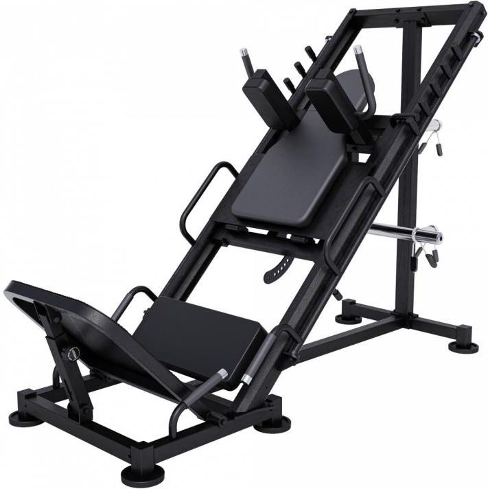 Prasa do nóg i hack-squat MAXXUS 2w1 Wypychanie i przysiady nawet do 400 kg obciążeń! Niezwykle stabilna konstrukcja z rur stalowych Szybkie blokowanie suwnicy dla bezpiecznego treningu Konwersja z prasy do nóg na przyrząd do przysiadów w kilka sekund Wygodne oparcie Duży, regulowany podnóżek Chromowane uchwyty do obciążeń do średnicy otworu 50/51 mm Wymiary: (Dł. x Szer. x Wys.) 2000x 968 x 4771 mm Długość wspornika ciężarów: 44 cm Waga: 130 kg Konstrukcja z mocnych grubych profili stalowych malowanych proszkowo imponuje doskonałym wykonaniem i bardzo wysoką stabilnością. Trening z dużymi obciążeniami wymaga dużej stabilności i dużej masy! Połączenie prasy do nóg i maszyny hack-squat jest idealne do kompleksowego treningu nóg. Przejście z prasy do nóg na maszynę hack-quat zajmuje tylko kilka sekund, a czasy przerw są zredukowane do minimum dzięki szybkiemu przekształceniu. Szerokie, łatwo dostępne uchwyty umożliwiają bezpieczną obsługę blokady suwnicy. Daje to bezpieczeństwo, szczególnie podczas bardzo ciężkich treningów z dużą wagą obciążeń (obciążenia nie są dołączone do maszyny!).