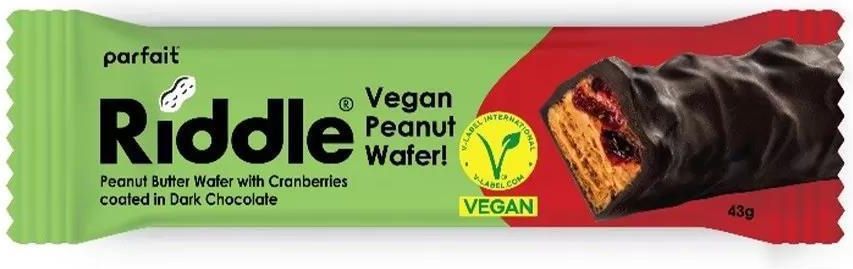 Wegański baton z masłem orzechowym i żurawiną w ciemnej czekoladzie Riddle, 43 g Wegański batonik z masłem orzechowym i żurawiną w polewie z ciemnej czekolady. Składniki: Masło ORZECHOWE (40%) (ORZESZKI ZIEMNE (95%), olej roślinny, tłuszcz kakaowy, sól), gorzka czekolada (31%) (masa kakaowa, cukier, tłuszcz kakaowy, emulgator: lecytyna SOJOWA, aromat), suszona żurawina (17%), wafel (12%) (mąka PSZENNA, oleje roślinne nierafinowane, skrobia kukurydziana, błonnik PSZENNY, substancja wypełniająca: węglany sodu, konserwant: sorbinian potasu, emulgator: lecytyna SOJOWA, barwnik: karmel, sól). Wartość odżywcza w 100 g: Wartość energetyczna: 2294 kJ/548 kcal Tłuszcz: 34 g w tym nasycone kwasy tłuszczowe: 11 g Węglowodany: 46 g w tym cukry: 25 g Błonnik: 4 g Białko: 13 g Sól: 0,407 g Alergeny: Brak Sposób przechowywania: Przechowywać w suchym i chłodnym miejscu. Producent: