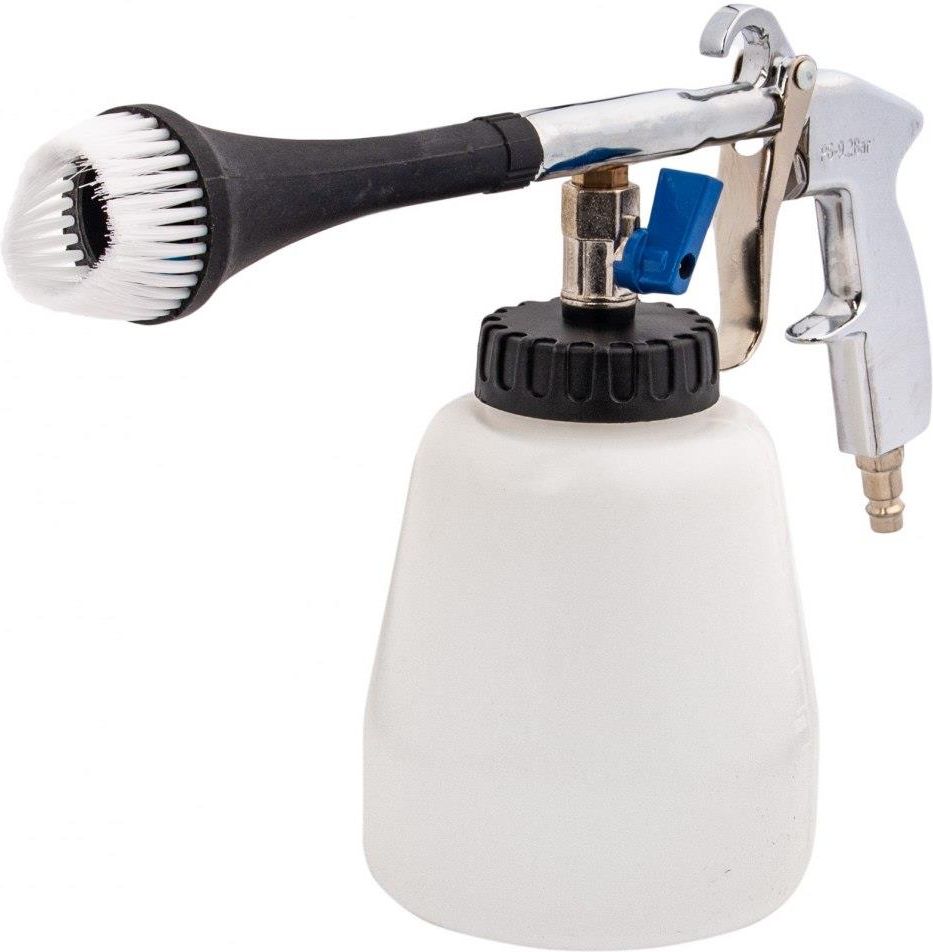 Pneumatyczny pistolet czyszczący do czyszczenia tapicerki 1 L Doskonały pistolet do skutecznego czyszczenia na mokro wszelkiego rodzaju zabrudzeń karoserii i wnętrza samochodu m.in. wylotów powietrza, klimatyzacji, elementów lustrzanych i z tworzywa, siedzeń, tapicerki, dywaników oraz wszelkiego rodzaju trudnego do usunięcia brudu i zanieczyszczeń. Pistolet dzięki specjalnie ukształtowanej dyszy z wirującym rdzeniem, wytwarza pod wpływem sprężonego powietrza, spieniony roztwór czyszczący, który czyści wszystkie elementy, zwilżając je w niewielkim stopniu. Bardzo wydajnym urządzeniem, zużywa minimalne ilości wody i środków czyszczących i jest na tyle skuteczny, że nie ma potrzeby używania żadnych środków agresywnych i szkodliwych dla środowiska i zdrowia. Dociera do wszelkich trudno dostępnych miejsc, szczelin, tam gdzie nie dotrze zwykła gąbka, szmatka, szczotka czy pędzelek. Do pracy nie potrzebuje dużych kompresorów, wystarczy ciśnienie 5bar. wysoka jakość ergonomiczny łatwy w obsłudze duża siła czyszczenia. rękojeść wykonana z materiału odpornego na korozję, regulacja chemii - niskie zużycie środka czyszczącego