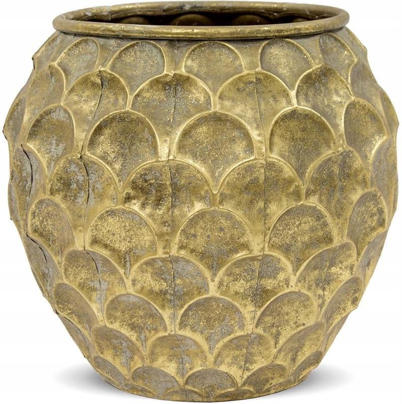 Metalowa osłonka złota okrągła - wysokość 32 cm Osłonkę z tej oferty wykonano z metalu. Prezentuje się ona w barwie brudnego złota. Taki kolor świetnie współgra z dekoracyjnym motywem rybiej łuski, jaki w niej zastosowano. Stworzony w ten sposób design ma sprawić, że osłonka nabiera antycznych …