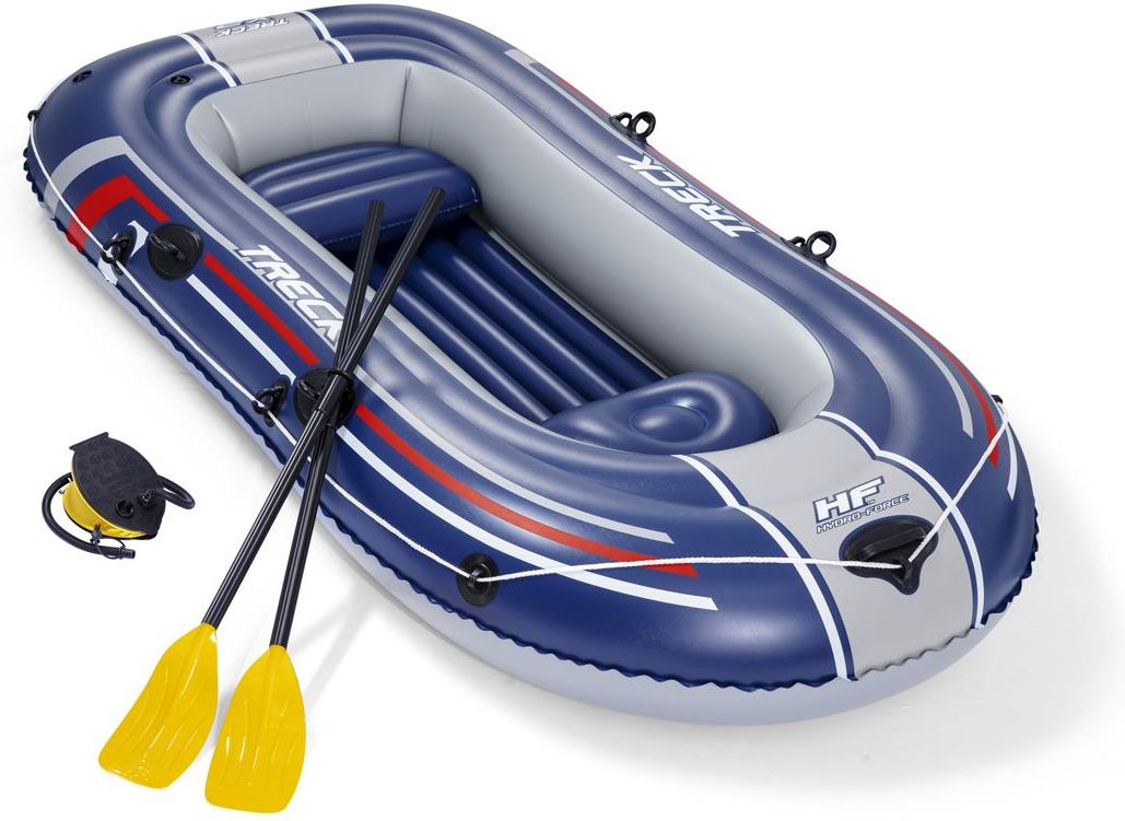 Wymiary: 255 x 127 cm Przeznaczony dla 2 osób dorosłych + dziecka Maksymalne obciążenie: 225 kg Ponton otoczony liną do trzymania z wbudowanymi przelotkami Nadmuchiwana podłoga dla dodatkowe komfortu Nadmuchiwane poduszki do siedzenia Dodatkowo w zestawie pompka nożna, para wioseł oraz łatka naprawcza