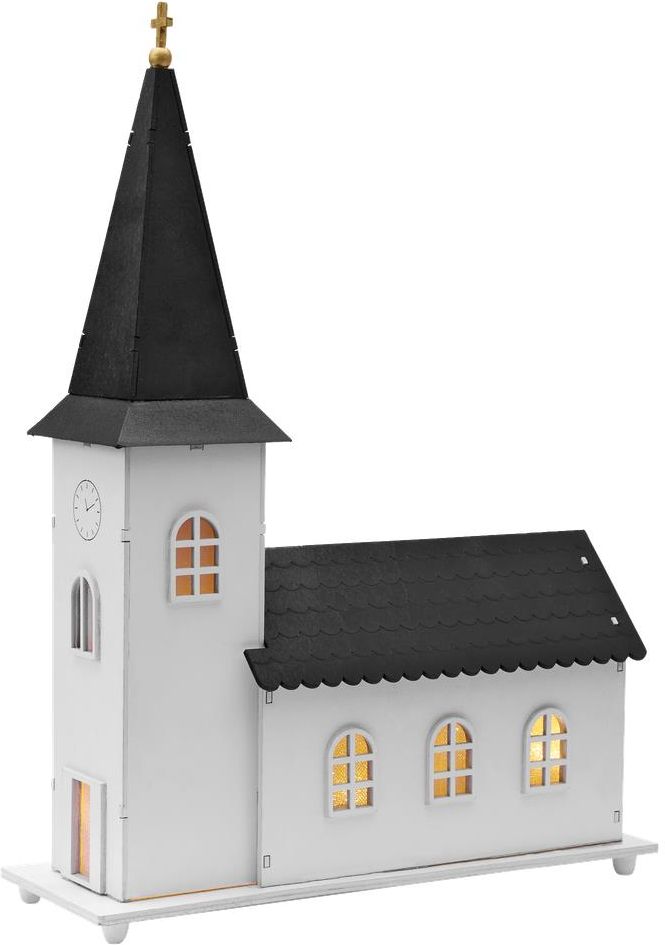 Kościółek z mechaniczną pozytywką i zasilanym akumulatorowo oświetleniem LED. Gra kolędę „O Holy Night”.