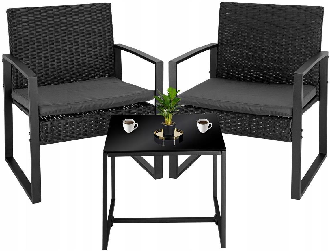 ZESTAW MEBLE OGRODOWE TECHNORATTAN KOMPLET NA TARAS BALKON KOMPLET CZARNY W zestawie stolik i dwa krzesła Wykonany z technorattanu i stali Stolik wyposażony w szkło hartowane Poduszki w zestawie Zakup od producenta Zestaw mebli ogrodowych Coffi szare poduszki – Komfort i styl na Twoim tarasie …