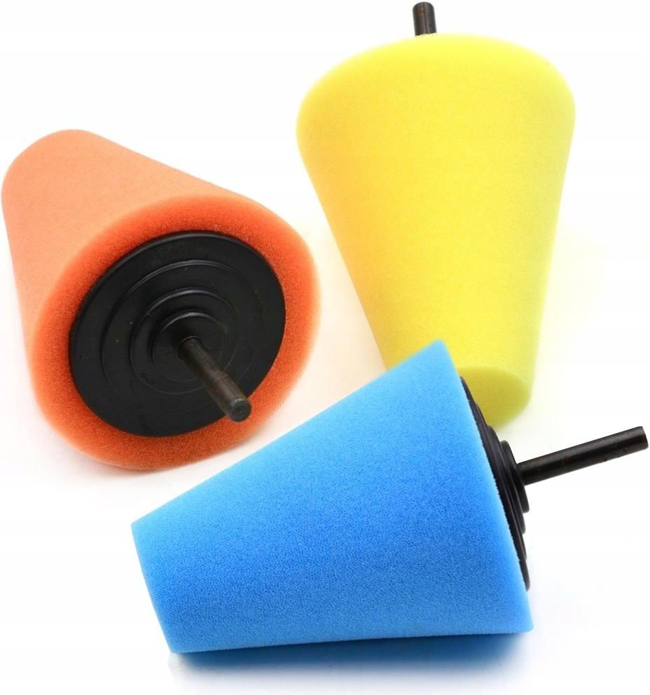 GĄBKA POLERSKA STOŻEK POLERSKI Profesjonalny stożek polerski, idealny do polerowania w trudno dostępnych miejscach, np. w zakamarkach felg, końcówek wydechu. Łatwy montaż i obsługa: Gąbka polerska jest przeznaczona do montażu na wkrętarkę lub wiertarkę, co sprawia, że ​​jej użycie jest niezwykle wygodne i efektywne. Wystarczy zamocować stożek na narzędziu i rozpocząć proces polerowania. Wyjątkowa wszechstronność: Dzięki precyzyjnemu kształtowi i elastycznej gąbce, możesz łatwo dotrzeć do nawet najbardziej wymagających obszarów i uzyskać doskonałe rezultaty. Dane techniczne: Wymiary: 6 mm (średnica chwytu), 28 mm (długość uchwytu) Maksymalna średnica gąbki: 72 mm Minimalna średnica gąbki: 32 mm Długość gąbki: 85 mm Gąbki polerskie stożkowe 3 sztuki o różnej gramaturze: Pomarańczowa(Miękka), Niebieska (Średnia), Żółta( Twarda)