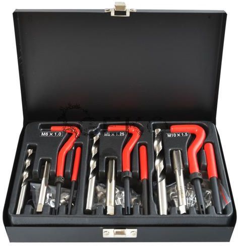 Zestaw do naprawy, regeneracji gwintów M6, M8, M10 G02789: Gwintowniki jednostopniowe, nacinają gwint w który wprowadza się wkładkę spiralną z twardej stali nierdzewnej. Do wprowadzenia wkładki służy pokrętło prowadzące oraz wybijak, który obłamuje wystającą końcówkę wkładki. Przeznaczone do gwintów M6 x 1,0 ; M8 x 1,25 ; M10 x 1,5 Wiertła i gwintowniki wykonane ze stali szybkotnącej HSS Liczba elementów w zestawie: 88 Zawartość zestawu: wiertła do rozwiercenia uszkodzonego gwintu - 3 sztuki gwintowniki jednostopniowe do wykonania gwintu pod nową wkładkę - 3 sztuki wkłady M6 x 1,0 x 10mm - 25 sztuk wkłady M8 x 1,25 x 10,8mm - 25 sztuk wkłady M10 x 1,5 x 13,5mm - 25 sztuk pokrętła do wkręcenia wkładek spiralnych - 3 sztuki wybijaki - 3 sztuki metalowa walizka