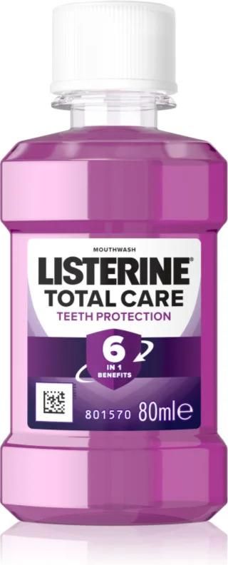Listerine Total Care Teeth Protection, 80 ml, Płyny do płukania unisex, Płyn do płukania jamy ustnej Listerine Total Care Clean Mint nie tylko odświeża oddech, ale jednocześnie walczy z osadem nazębnym i pomaga zachować zdrowe dziąsła i zęby. Właściwości: zapobiega rozwojowi próchnicy zębów ochrona przed nalotem na zębach niszczy bakterie wzmacnia szkliwo utrzymuje zdrowe dziąsła zapewnia świeży oddech Sposób użycia: Po wyczyszczeniu zębów przepłucz usta płynem do płukania jamy ustnej przez tyle czasu, ile podano na opakowaniu, a potem wypluj.