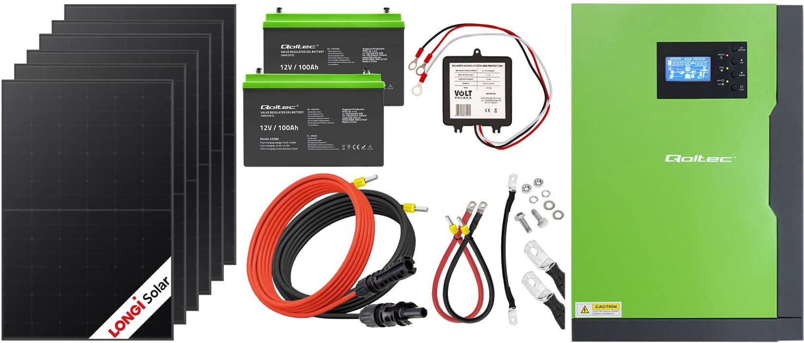 Off-gridowy zestaw solarny 3500W: 6 x paneli 430W + 2 x GEL 100AH + balanser 24V + przewody do połączenia + hybrydowy inwerter solarny Off-Grid Qoltec Świętochłowice