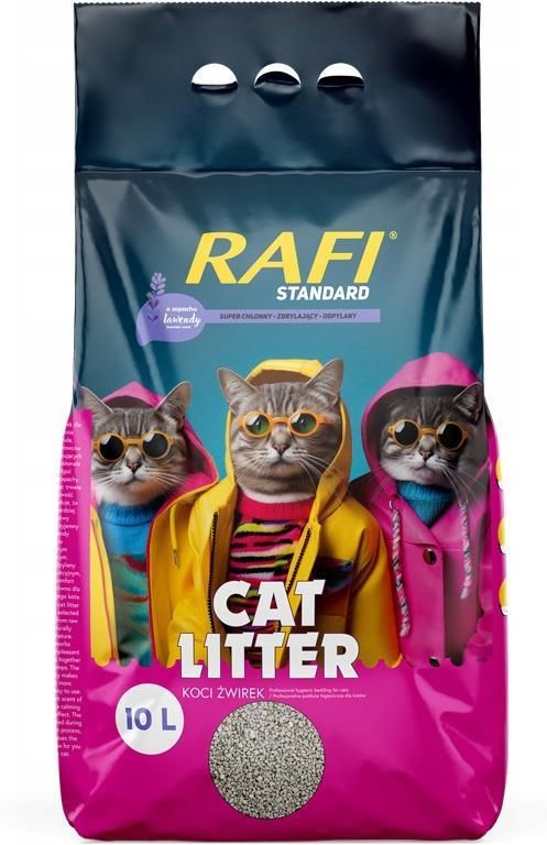 Rafi Zbrylający żwirek dla kota o zapachu lawendy Standard 10 l Żwirek Rafi Standard to jeden z najpopularniejszych żwirków higienicznych przeznaczonych dla kotów. Seria Standard wyróżnia się grubszymi granulkami o frakcji 1–4 mm. Żwirek zawiera lawendową kompozycję zapachową, która działa przyjemnie i uspokajająco. Olejki lawendowe mają dodatkowo właściwości aseptyczne i pomagają redukować napięcia nerwowe. Produkt jest szczególnie polecany młodym, aktywnym kotom, które często przebywają na zewnątrz. Zapewnia skuteczną ochronę antybakteryjną, a dzięki swojej strukturze zbryla się w regularne, zwarte bryłki.
