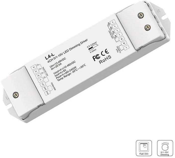 L4-L - odbiornik LED sterowany ściemniaczami 0-10V / PUSH-DIM L4-L to czterokanałowy sterownik ściemniania przeznaczony do współpracy ze ściemniaczami 0/1-10V i przyciskami zwiernymi (funkcja PUSH-DIM) w celu regulacji jasności oświetlenia monochromatycznego (np. taśmy LED). Dzięki temu odbiornikowi możliwe jest niezależne sterowanie czterema odcinkami pasków ledowych. Do kontroli jasności światła wykorzystywane są panelowe ściemniacze 0-10V lub 1-10V, a także przyciski zwierne np. dzwonkowe realizujące funkcję ściemniania PUSH-DIM. Zakres ściemniania 0-100% z charakterystyką logarytmiczną jest przyjazny dla naszego wzroku. Szeroki zakres napięcia zasilania 12-48VDC. Maksymalny prąd wyjściowy to 5A na kanał. To wysokiej klasy urządzenie wykonane z markowych komponentów. Gwarancja 5 lat. Producent SKYDANCE. Cechy sterownika L4-L SKYDANCE • cztery kanały wyjściowe• dedykowany do ściemniaczy 0/1-10V• funkcja przyciemniania Push-Dimming• zakres ściemniania 0-100% poprzez charakterystykę logarytmiczną• częstotliwość PWM 500Hz• napięcie wejściowe / wyjściowe 12-48V DC• maksymalny prąd wyjściowy 4x5A• przeznaczony do oświetlenia monochromatycznego (np. taśmy LED)• możliwość ściemniania lamp fluorescencyjnych kompatybilnych z oświetleniem LED• zabezpieczenie przed przegrzaniem / przeciążeniem / zwarciem• gwarancja 5 lat Wymiary i wyprowadzenia Schemat połączeń Wejście 0/1-10 V można obsługiwać za pomocą dostępnych w handlu obrotowych ściennych ściemniaczy 0/1-10 V lub z dedykowanego centralnego systemu ściemniania.● zgodność z 0-10 V, 1-10 V, 10 V PWM, RX (4 w 1)● zaleca się, aby liczba sterowników LED podłączonych do ściemniacza 0/1-10V nie przekraczała 50 sztuk, a maksymalna długość przewodów od ściemniacza do źródła światła nie przekraczała 50 metrów Funkcja Push Dim ● Krótkie naciśnięcie: włącz lub wyłącz światło.● Długie naciśnięcie (1-6 s): naciśnij i przytrzymaj, aby płynnie ściemniać, przy każdym kolejnym długim naciśnięciu poziom światła zmienia się w przeciwnym kierunku.● Pamięć: światło powraca do poprzedniego poziomu ściemniania po wyłączeniu i ponownym włączeniu, nawet w przypadku awarii zasilania.● Synchronizacja: jeśli do tego samego przełącznika przyciskowego podłączonych jest więcej niż jeden sterownik ściemniający, naciśnij i przytrzymaj przycisk przez ponad 10 sekund, system zostaje zsynchronizowany i wszystkie światła w grupie przyciemniają się do 100%.Oznacza to, że w większych instalacjach nie ma potrzeby stosowania dodatkowego przewodu synchronicznego. Zaleca się, aby liczba sterowników podłączonych do wyłącznika przyciskowego nie przekraczała 50 sztuk, a maksymalna długość przewodów od przycisku do sterownika nie powinna przekraczać 50 metrów. Dlaczego warto kupić ten 4-kanałowy ściemniacz 0-10V? Kupując jedno 4-czterokanałowe urządzenie można niezależnie zarządzać jasnością czterech źródeł światła monochromatycznego. Logarytmiczna krzywa ściemniania zapewni przyjazne dla oczu przyciemnianie oświetlenia np. taśm LED. Do sterowania urządzeniem i regulacji jasności wykorzystywane są panelowe ściemniacze 0-10V lub popularne przyciski np. dzwonkowe. Oferowany sterownik został wykonany z najwyższej jakości komponentów i posiada 5-cio letnią gwarancję. Rekomendujemy ściemniacze 0/1-10V z naszej oferty do sterowania tym sterownikiem. Zapraszamy do zakupów.