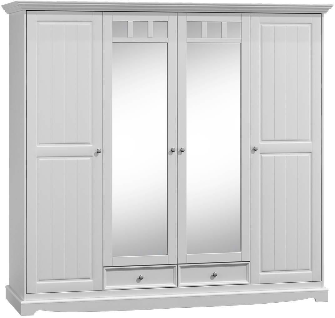 Szafa czterodrzwiowa z lustrami z dwiema szufladami i dziewięcioma półkami z naturalnego drewna sosnowego w kolorze białym. Cokół w kolorze białym.
