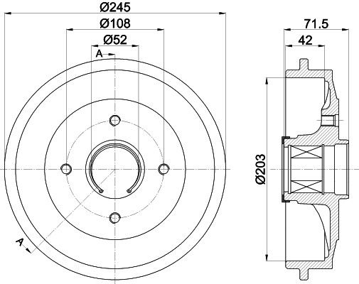 Średnica zewnętrzna bębna hamulca [mm]: 245 Średnica wewnętrzna bębna hamulca [mm]: 203 Całkowita wysokość bębna hamulcowego [mm]: 71,5 Wewnętrzna wysokość bębna hamulcowego [mm]: 42 Maksymalna wielkość poślizgu bębna [mm]: 204,5 Wzór otworów/liczba otworów: 04/04 Ø rozmieszczenia otworów [mm]: 108 …