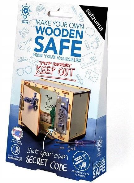 Najwięcej satysfakcji daje nam to, co zrobimy sami. Satysfakcja będzie podwójna, jeśli to co zbudujemy, pozwoli ukryć swoje skarby przed domownikami. Sejf składa się z ponad 40 elementów do samodzielnego złożenia. Elementy są wykonana z drewna i po złożeniu można je dodatkowo pomalować. W zestawie znajduje się również mechanizm zamykający do którego możesz ustawić swój własny, 3 cyfrowy kod. Budowa własnego sejfu rozwija zdolności techniczne. W wyniku własnej pracy dziecko otrzymuje działający sejf, w którym może ukryć swoje skarby. SPECYFIKACJA: Zbuduj Swój Sejf (Make Your Own Wooden Safe) Ponad 40 elementów do samodzielnego złożenia Drewniana konstrukcja oraz elementy metalowe Czytelna instrukcja obrazkowa Malowanie sejfu jest opcjonalne, farby nie są dołączone Wymiary sejfu: 13 x 8 x 9cm