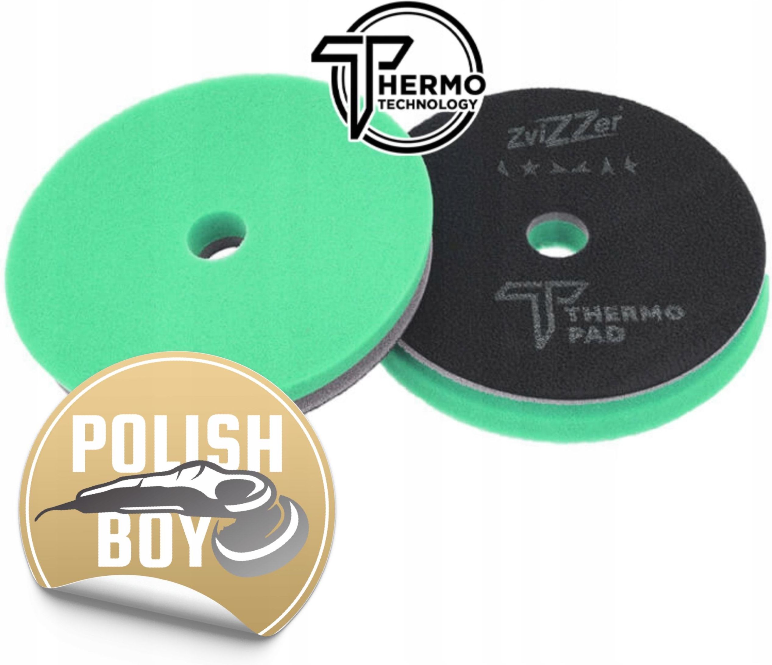 ZviZZer PRO THERMO PAD GREEN VERY HARD 140/20/125, zielona gąbka polerska tnąca Innowacyjny, pad polerski o średniej twardości z serii ZviZZer PROFESSIONAL THERMO POLISHING SYSTEM przeznaczony na maszyny Dual Action. Stworzony dla profesjonalistów i lakierników do usuwania średniej głębokości zarysowań na lakierze. Znakomicie sprawdza się do korekty jednoetapowej, jest bardzo uniwersalny, to jeden z najczęściej wybieranych padów do one stepa! Wykonany w rewolucyjnej technologii THERMO z pianki otwartokomórkowej niezwykle odpornej na działanie wysokiej temperatury. Dzięki temu bardzo szybko i skutecznie usuwa zarysowania z powierzchni. Pady polerskie z serii THERMO są 5-6 razy trwalsze od standardowych padów. THERMO PAD nie traci swoich właściwości tnących pod wpływem ciepła oraz lepiej odprowadza ciepło z polerowanej powierzchni. Zachowuje wysoki poziom cięcia przez cały czas pracy i nie mięknie podczas polerowania. Wyróżnia się większą stabilnością, poprawiając wygodę pracy. Doskonale współpracuje z pastą ZviZZer THERMO HC1500 z linii profesjonalnej oraz HC4000 z linii detailing. Innowacyjna technologia THERMO PADS: Termostabilna struktura zastosowanej pianki typu THERMO, Bardzo duża odporność na wysoką temperaturę, Stabilny i długotrwały proces cięcia, Wolniejsze nagrzewanie powierzchni, Większa wygoda pracy, Bardzo wysoka żywotność. ZviZZer THERMO PADS są dostępne w sześciu twardościach: GREY – Ultra Hard – ultra twardy (20kPa.) GREEN – Very Hard – bardzo twardy (17 kPa.) WHITE – Hard – twardy /one step (14 kPa.) BLUE – Medium – średni / one step (11 kPa.) RED – Soft – miękki (8 kPa.) BLACK – Ultra Soft – bardzo miękki (5 kPa.) Pady występują w rozmiarach: średnica powierzchni roboczej / grubość / średnica rzepa 160 / 20 / 150 mm 140 / 20 / 125 mm 90 / 20 / 80 mm 70 / 20 / 55 mm 55 / 20 / 35 mm ZviZZer PROFESSIONAL THERMO POLISHING SYSTEM MORE CUT LESS TIME – BEST RESULTS System polerski stworzony dla profesjonalnych detailerów pozwalający osiągnąć doskonały efekt końcowy przy minimalnym nakładzie pracy, dzięki zastosowaniu innowacyjnej technologii THERMO. Pady polerskie z tej serii są kilkukrotnie trwalsze od standardowych padów oraz oferują niezwykłą wygodę i szybkość pracy.