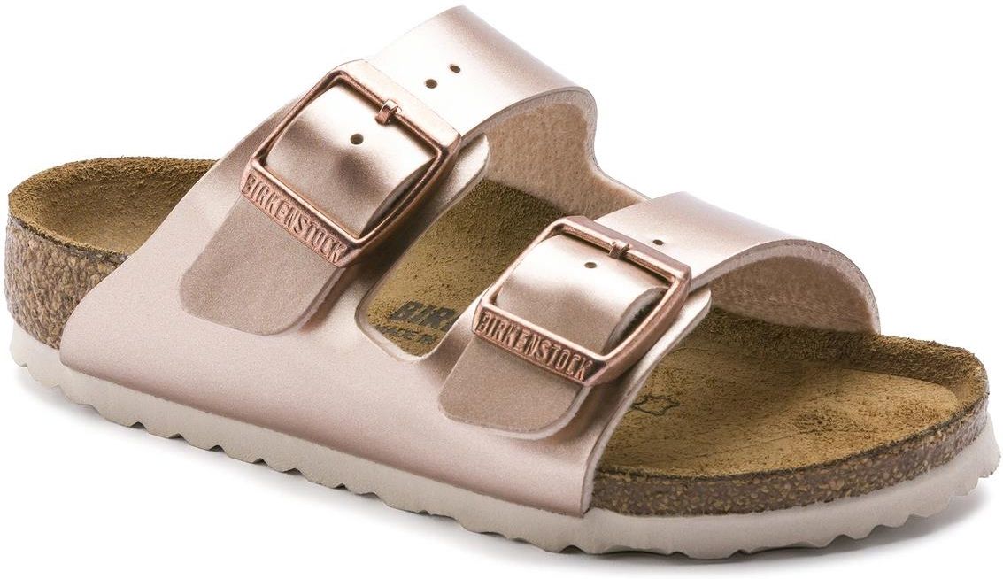 BIRKENSTOCK Arizona to prawdziwy klasyk, który od dziesięcioleci zachwyca swoim ponadczasowym wzornictwem. Sandał z dwoma paskami leży idealnie na dziecięcej stopie – nawet w trakcie najbardziej szalonych aktywności. Sandały zostały zaprezentowane w nowej odsłonie – z ekstrawaganckim, elektryzująco-metalicznym wykończeniem. Zastosowana do wykończenia lśniąca folia pozwala rozbłysnąć temu klasycznemu modelowi nowym blaskiem i sprawi, że każda stylizacja wzbudzi powszechne zainteresowanie. Kolorystycznie dopasowana podeszwa zewnętrzna oraz sprzączki stanowią dopełnienie wyrafinowanego wyglądu buta. Materiał wierzchni stanowi przyjazny dla skóry i wytrzymały materiał syntetyczny Birko-Flor®. Anatomicznie ukształtowana wkładka korkowo-lateksowa Materiał wierzchni: Birko-Flor® Wyściółka: Skóra welurowa Podeszwa: Pianka EVA Szczegóły: dwa paski, każdy wyposażony w indywidualnie regulowaną sprzączkę z metalu “Made in Germany” Materiał wierzchni: Birko-Flor® Materiał Birko-Flor® jest wykonany z łatwego w pielęgnacji i higienicznego PVC, który od wewnątrz został podszyty miękką, oddychającą warstwą polaru. Wysokogatunkowy, wygodny, wytrzymały materiał bardzo delikatny dla skóry. Wkładka do butów: Zamsz Elastyczna skórzana podszewka, która jest delikatna dla skóry, otula Twoje stopy i dopasowuje się do ich kształtu. Otwarta, porowata, i dzięki temu oddychająca, powierzchnia zapewnia stopom komfortowy klimat, nawet podczas najbardziej wyczerpującej aktywności fizycznej. Materiał wkładki: Korek Korek jest ekologicznym materiałem pozyskiwanym z kory dębu korkowego. Ten naturalny produkt ma właściwości izolujące i zapewnia bardzo dobrą amortyzację. Podeszwa zewnętrzna: EVA Tworzywo EVA (kopolimer etylenu i octanu winylu) jest wysokiej jakości, bardzo lekkim elastycznym materiałem zapewniającym bardzo dobrą amortyzację. Dzięki temu wygładza drobne nierówności podłoża i sprawia, że każdy krok jest delikatnie amortyzowany.
