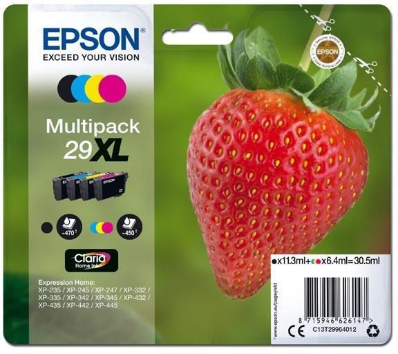 Tusz 29XL Claria Home, multipack 4szt. CMYK Atrament 29XL Claria Home idealnie nadaje się do niedrogiego i niezawodnego drukowania bez kompromisów. Dostępne w rozmiarach standardowych i XL oraz w opakowaniach pojedynczych i zbiorczych Multipack, co pozwala na elastyczne zastąpienie tylko takiego koloru, jakiego potrzebujesz. Nieskomplikowane i niezawodne drukowanie dzięki zastosowaniu oryginalnych atramentów firmy Epson. Gwarantowana kompatybilność pracy z drukarką i uzyskanie najlepszych wyników. Niższe koszty druku przy korzystaniu z wkładów XL Atramenty mają bardzo atrakcyjną cenę, a dzięki oddzielnym wkładom możesz wymienić tylko zużyty kolor. Dzięki większym pojemnikom z tuszem w rozmiarze XL możesz wydrukować do 470 stron w czerni i do 450 stron w kolorze. Kompatybilność Expression Home XP-235, 245, 247, 332, 335, 342, 345, 432, 435, 442, 445 Atramenty Epson są zoptymalizowane do współpracy z drukarkami Epson Atrament Claria Home firmy Epson to wszechstronny, czterokolorowy zestaw wkładów atramentowych, który zapewnia wyraźne wydruki tekstu wysokiej jakości oraz błyszczące zdjęcia jak ze studia fotograficznego. Idealnie nadaje się do niedrogiego i niezawodnego drukowania bez kompromisów. POZOSTAŁE KOLORY Z TEJ SERII:
