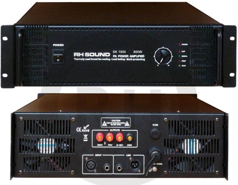 Radiowęzłowy koniec mocy wyposażony w transformator 100V o szerokim paśmie przenoszenia częstotliwości, komplet przeciwzwarciowych zabezpieczeń oraz wymuszone chłodzenie stopnia mocy. Wejście symetryczne XLR/ nie symetryczne Jack 6,3mm, Wyjście LINK symetryczne XLR/ nie symetryczne Jack 6,3mm. Cechy: Moc wyjściowa RMS: 800W/ 100V/70V.Wyjście niskoimpedancyjne: 8 - 16 Ohm.Pasmo przenoszenia: 50Hz - 18000Hz.Zniekształcenia: 0,1%Stosunek Sygnał/Szum: >96dBCzułość/impedancja wejścia: 0dB/ 10kOhmRozmiar: RACK 19"Zasilanie: 230V~/50Hz.Wymiary: 480 mm x 133 mm x 460 mm.Waga: 27 kg