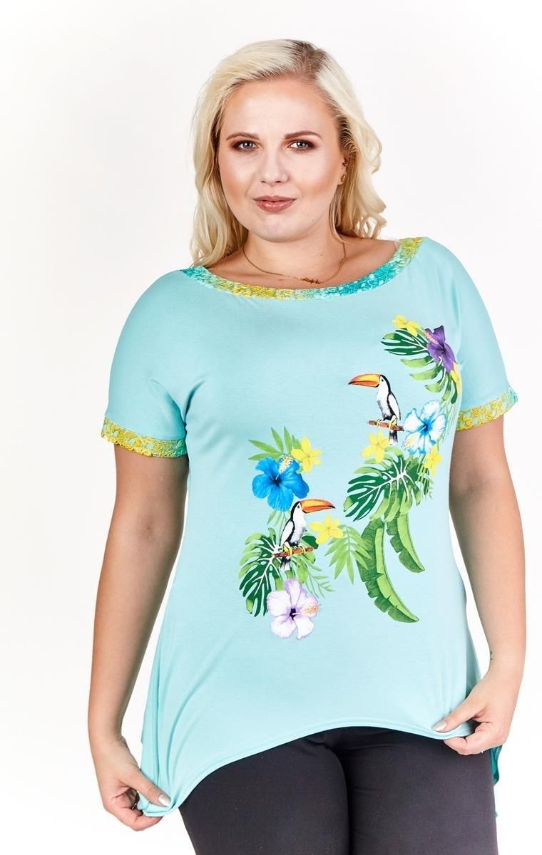 Tunika codzienna. Została uszyta z bardzo miłej w dotyku dzianiny – wiskozy. Na bluzeczce wyhaftowany został bardzo kolorowy, egzotyczny element Jest luźna, dopasuje się do każdej figury. Dekolt typu łódka, zaakcentowany koronką. Rękaw - kimono, krótki z koronkowym mankietem o szerokości 2,5cm Dół …