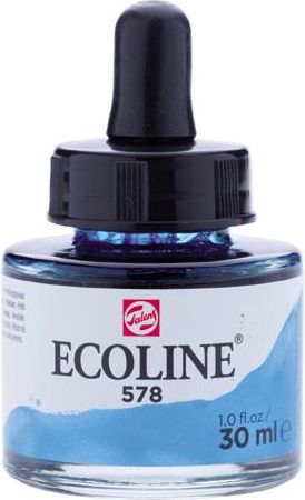 Talens Ecoline skoncentrowana farba akwarelowa w stanie płynnym pojemność: 30 ml kolor: 578 Sky Blue Cyan odznacza się wspaniałą przyswajalnością do papieru akwarelowego, rysunkowego lub tektury Ecoline to wszechstronność w użyciu w połączeniu z różnego rodzaju materiałami; doskonale nadaje się do prac projektowych, do lawowania prace powinny być przechowywane z dala od światła aby zapobiec utracie kolorów doskonale sprawdza się w malarstwie akwarelowym, ale także w rysunku architektonicznym, i wszelkich technikach hobby znakomicie nadaje się do znakowania i pieczętowania produkowane 46 transparentnych kolorów oraz 2 kryjące (złoty i biały) opakowanie: kwadratowa zakręcana butelka produkt holenderskiej firmy Talens
