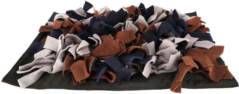 DINGO Mata węchowa 60 x 40 cm Mata węchowa dla psów. ZALETY można prać ręcznie w max 30°, pełna, szyta podstawa antypoślizgowa bez dziurek, materiały najwyższej jakości, mocne szycie nićmi kaletniczymi, niesamowita zabawa dla każdego pupila, możliwość złożenia, posiada wygodne uchwyty, wodoodporna, dla psów i kotów, Węszenie u psów to najbardziej naturalna czynność dlatego warto dostarczyć zwierzęciu matę węchową, która służy przede wszystkimdo stymulacji sensorycznej i pomaga rozwijać umysł zwierzęcia. Pupil czuje nosem schowany przysmak, ale go nie widzi więc musi się skupić na swoim węchu. Produkt jest bardzo wytrzymały , został wykonany z najwyższej jakości materiałów. Podstawa jest antypoślizgowa i nie ma dziurek, dzięki czemu smakołyki nie wypadają na podłogę . Paski z materiału polarowegoprzyszywane są mocnymi nićmi kaletniczymi, co sprawia, że mata jest bardzo wytrzymała i nadaje się nawet dla dużych psów. Zabawa węchowa sprawdza się u zwierząt lękliwych oraz nadpobudliwych. Dla pupili niepełnosprawnych mata węchowa to jeden z niewielu sposobów na wspólne spędzenie czasu z jego człowiekiem. Dodatkowo możesz ją zwinąć w rulon, a dzięki uchwytom łatwo zabierzesz ją ze sobą. Uwaga! Pierwsze sesje warto wykonać razem z psem – pokazać mu, że smaczki są ukrywane i zachęcić do spokojnego ich szukania. Warto poświęcić trochę czasu na wspólne odkrywanie zabawy węchowej. Szczególnie należy uważać, kiedy uczyliśmy psiaka, głównie szarpania. ROZMIAR - 60 x 40 cm (wymiar całkowity razem z frędzelkami) ID:40573