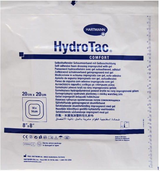 Zastosowanie: do zaopatrywania ran trudno gojących się, zarówno sączących jak i relatywnie suchych, w fazie ziarninowania i epitelializacji doskonale nadaje się do stosowania w połączeniu z terapią kompresyjną w przypadkach owrzodzeń podudzi pochodzenia żylnego. Charakterystyka: - HydroTac jest kombinacją opatrunku piankowego z hydrożelem, - podstawą opatrunku jest pianka poliuretanowa, warstwę opatrunku od strony rany stanowi hydrożel, - warstwa hydrożelu ma postać siatki, co pozwala na swobodne przejście wysięku do chłonnej warstwy piankowej, - pianka poliuretanowa szybko wchłania nadmiar wysięku rany i zamyka go w swojej strukturze. Nie oddaje go nawet pod wpływem terapii uciskowej, - hydrożel uwalnia wilgoć do rany utrzymując w niej wilgotne środowisko, sprzyjające ziarninowaniu i odbudowie nabłonka, - hydrożel zapobiega przyklejaniu się opatrunku do rany. Zmiany opatrunku przebiegają bezboleśnie, - warstwa hydrożelu daje opatrunkowi efekt początkowej przylepności „Initial Tack”. Dzięki temu zakładanie opatrunku staje się dużo prostsze, - od strony zewnętrznej opatrunek pokryty jest wodoodporną folią poliuretanową, chroni ranę przed wnikaniem drobnoustrojów chorobotwórczych, nie utrudnia jednak przepływu powierza i pary wodnej, - dodatkowo wyposażony w folię samoprzylepną, ułatwiającą mocowanie opatrunku na skórze.