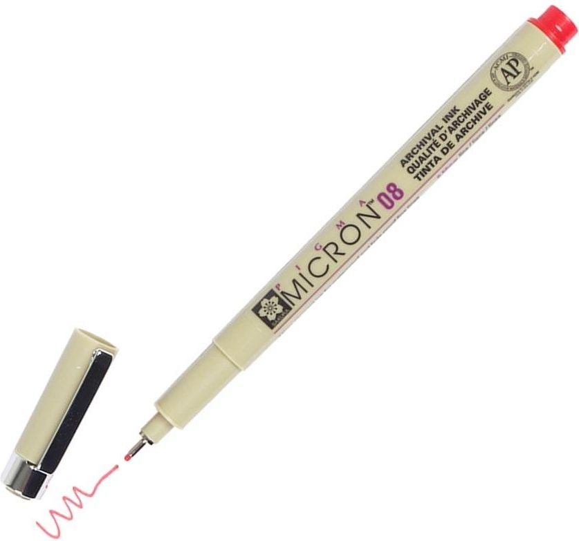 Sakura Pigma 08 Micron Cienkopis 19 Red 0,5mm Sakura Pigma Micron 08 to profesjonalne, precyzyjne cienkopisy z unikalnym tuszem archiwalnym na bazie wody cienkopisy doskonale nadają się do pisania oraz rysunku technicznego, prac plastycznych, ilustracji; zastosowań hobbystycznych, takich jak scrapbooking; polecane także do popularnej techniki ZENTANGLE zalecane dla antropologów, entomologów, archiwistów, architektów, do wykonania profesjonalnych wzorównfrezów diamentowych, rysowników (Manga i Anime), artystów ilustratorów, artystów piszących po tkaninach budowa końcówki dozującej tuszu jest tajemnicą firmy i zapewnia doskonałą kontrolę, lekkość kreślenia i idealny przepływ tuszu pod każdym kątem szybkoschnący i nie przesiąkliwy przez papier grubość linii: 0,5 mm; końcówka metalowa kolor: czerwony(19 Red) produkowane wielkości ultra cienkich liniach: 005 (0,2 mm), 01 (0,25 mm), 02 (0,3 mm), 04 (0,35 mm), 05 (0,45 mm) i 08 (0,5 mm) zawarty tusz Pigma Ink to jeden z najlepszych tuszy, gładko piszący pigmentowy na bazie wody, trwały na różnych rodzajach papieru, w tym na papierze bezkwasowym, kalce technicznej oraz na porowatych powierzchniach stabilny chemicznie, odporny na blaknięcie i wodoodporny (jakość archiwalna) bezwonny, szybkoschnący i nieprzesiąkliwy przez papier produkt japońskiej firmy Sakura