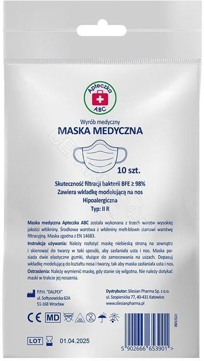 Oferujemy ORYGINALNE produkty SILESIAN PHARMA Apteczka ABC Maska medyczna 3-warstwowa 1op.-10szt w dobrej cenie. Unikaj podróbek, które mają niewiadomy skład, pochodzenie i mogą powodować uczulenia i choroby skóry! Autentyczność i jakość Gwarantowane! Zainwestuj w pewność, że to co dostajesz, jest autentyczne i pochodzi z legalnego źródła. Zaufaj Profesjonalizmowi i Doświadczeniu Dziękujemy za zaufanie i zapraszamy do dalszych zakupów w naszym sklepie, gdzie gwarantujemy autentyczność, jakość i obsługę na najwyższym poziomie. Dołącz do grona zadowolonych klientów! SILESIAN PHARMA Apteczka ABC Maska medyczna 3-warstwowa 1op.-10szt SILESIAN PHARMA Apteczka ABC Maska medyczna 3-warstwowa 1op.-10szt Maska medyczna została wykonana z trzech warstw wysokiej jakości włókniny. Środkowa warstwa z włókniny melt-blown stanowi warstwę filtracyjną. Maska zgodna z EN 14683. Cechy: -3 warstwowa -Typ: II R -Skuteczność filtracji bakterii BFE ≥ 98% -Zawiera wkładkę modelującą na nos -Hipoalergiczna -Bezlateksowa -10 szt. w opakowaniu -Jednorazowego użytku, -Niesterylna -Niebiesko-biała