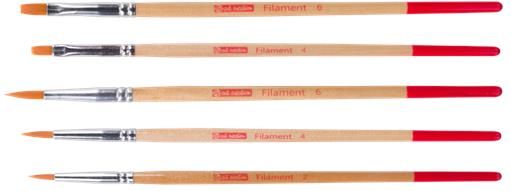 Zestaw pędzli poliestrowych - Talens Art - 5 szt. Zestaw pędzli poliestrowych z serii Filament. Pędzle posiadają specjalnie dobrane włókna poliestrowe o różnej długości. Pędzle filamentowe składają się z włókien syntetycznych (poliester) i nadają się do farb akwarelowych. Pędzle Filament mogą wchłonąć dużą ilość wody, dzięki czemu najlepiej sprawdzą się do mocno rozcieńczonych farb, takich jak akwarele, gwasze i tusze. Ze względu na wytrzymałość i sprężystość poliestru, pędzle filamentowe świetnie nadadzą się również do farb olejnych i akrylowych. Zestaw zawiera: 3 okrągłe pędzle w rozmiarach 2, 4 i 6 oraz 2 płaskie pędzle w rozmiarach 4 i 6.