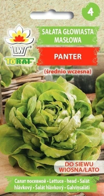 Nasiona warzyw Sałata masłowa głowiasta PANTER 1g Toraf Odmiana średnio wczesna, okres wegetacyjny 65-75 dni, do całorocznej uprawy w gruncie, szczególnie z siewu wprost do gruntu. Tworzy średniej wielkości, ciemnozielone, dobrze zamknięte główki. Odporna na wybijanie w pędy nasienne i mączniaka rasy BI 1-24. Wymaga gleby żyznej, wilgotnej ale przepuszczalnej. Przeznaczona do bezpośredniej konsumpcji, przyrządzania surówek i dekoracji potraw. Siew wiosną IV- V na głębokość 1cm, na zbiór jesienny w VIII. Siew: IV-V i VIII Zbiór: ½V-VII i IX-X Rozstawa: 30-40×20-25 cm