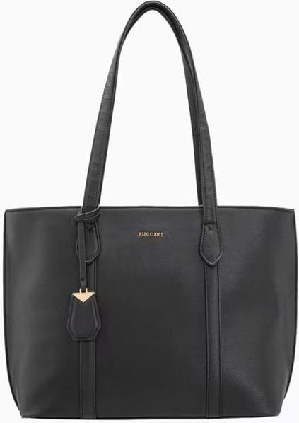 Torebka shopperka - czarna z elementami w złotym kolorze Torebka posiada jedną główną komorę. Wewnątrz znajdują się trzy dodatkowe kieszonki. Jedna jest zapinana na zamek, natomiast dwie pozostałe są otwarte. Wszystkie metalowe elementy torebki są w kolorze złotym. Na froncie widnieje logo PUCCINI. Natomiast na spodzie torebka posiada cztery nóżki, które zabezpieczają ją przed zniszczeniem. Najważniejsze cechy torebki: uszyta z wysokogatunkowej ekoskóry, praktyczne wnętrze. wymiary zewnętrzne: 29 x 16 x 34 cm waga: 0,81 kg materiał: skóra ekologiczna elementy metalowe: złote 2 lata gwarancji producenta