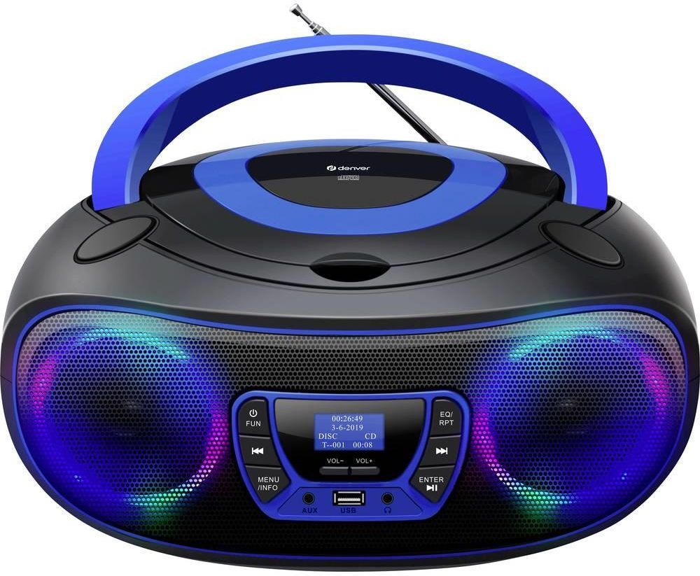 Denver TDB-212BU radio FM/DAB+, Bluetooth, CD, USB, niebieskie Boombox z radiem DAB+/FM, Bluetooth, USB, odtwarzaczem CD, wejściem AUX i efektami świetlnymi, z pilotem Elegancki boombox TDB-212 zapewnia szeroki wybór opcji słuchania. Znajdź swoją ulubioną stację DAB+ lub FM. Odtwarzaj ulubione …