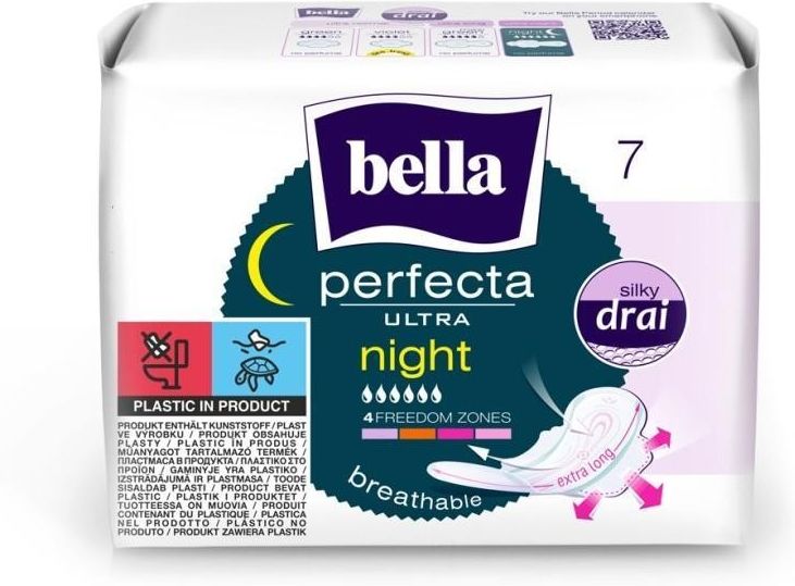 Opis BELLA Perfecta Ultra Night Silky Drai Podpaski higieniczne Extrawydłużone ultracienkie podpaski higieniczne, pokryte siateczką silky drai. Zalecane przy bardzo obfitych krwawieniach oraz na noc.
