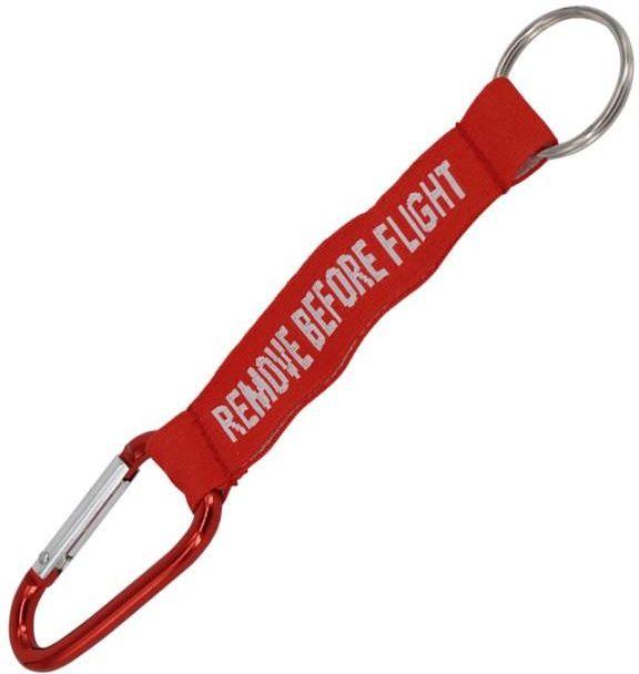 Brelok REMOVE BEFORE FLIGHT. Szczegółowe informacje brelok tekstylny z haftowanym napisem obustronny haft w białym kolorze: REMOVE BEFORE FLIGHT z metalowym kółkiem średnica kółka 3cm wymiary samej zawieszki: 13 x 3cm. Breloczek lotniczy! Solidny tekstylny brelok z wyhaftowanym z dwóch stron tekstem "REMOVE BEFORE FLIGHT" w nawiązaniu do dobrze znanych w obrębie lotnictwa czerwonych zawieszek ostrzegawczych, które koniecznie muszą być usunięte przed startem maszyny. Świetnie sprawdzi się jako zawieszka na klucze do domu lub samochodu czy na pendrive, kartę dostępową itd.