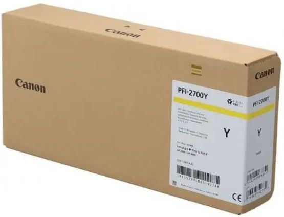 Canon PFI-2700Y  żółty Eksploatacja Rodzaj atramentu : pigmentowy Pozostałe parametry Kolor : Y - żółty (yellow) Pojemność [ml] : 700 Zgodność: CANON imagePROGRAF GP-2000 CANON imagePROGRAF GP-4000 CANON imagePROGRAF GP-2000DR CANON imagePROGRAF GP-4000DR