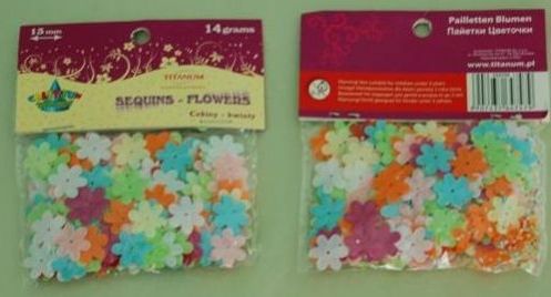 CEKINY dekoracyjne KWIATKI 13mm 14g mix kolorów TITANUM Zestaw kolorowych cekinów z dziurką w ksztalcie kwiatków w rozmiarze 13mm. Idealnie nadają sie do prac krawieckich, projektów plastycznych, scrapbookingu, kartek okolicznościowych czy ozdobnego pakowania prezentów. Kwiatki nadadzą dekoracji …