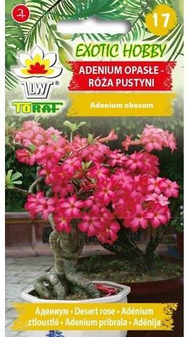 Adenium opasłe - Róża Pustyni 5 nasion (Adenium obesum) Wyjątkowy sukulent w formie pięknie kwitnącego wolno rosnącego drzewka, które wyglądem przypomina miniaturowego baobaba i można formować jak drzewko Bonsai. Od masywnego, nieforemnego pnia odchodzą grube, mocne pędy, które od IV- IX obsypane są masą różowych kwiatów. Wysiew nasion całoroczny, nasiona przed wysiewem moczymy w ciepłej wodzie przez 24 godziny, po czym możemy wysiewać na głębokość 1cm do ziemi dla kaktusów z dodatkiem perlitu. Zasiew podlewamy i odstawiamy w ciepłe miesce około 25 stopni.