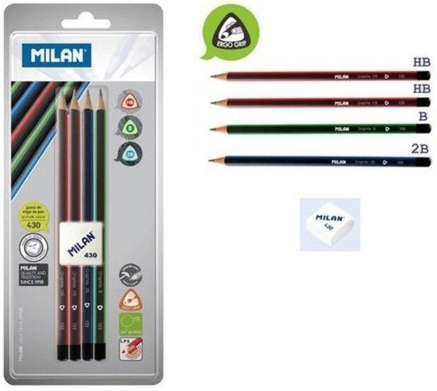 Zestaw 4 szt. ołówków trójkątnych z system ochrony rysika LPS zwiększającym odporność na złamanie. Grafit HB, B, 2B. Gumka MILAN 430: miękka gumka syntetyczna do ścierania większości rodzajów grafitu z każdego rodzaju papieru. Wymiary: 210x82 mm