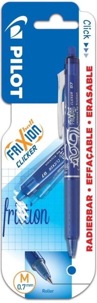 Niebieskie pióro kulkowe FriXion Clicker na blistrze, o rozmiarze końcówki piszącej 0.7. Pisz płynnie szeroką końcówką, wymaż silikonową gumką FriXion i zacznij od nowa! Bestseller marki Pilot pozwala na czyste pisanie i usuwanie atramentu poprzez pocieranie - wszystko za pomocą tego samego pisaka. …