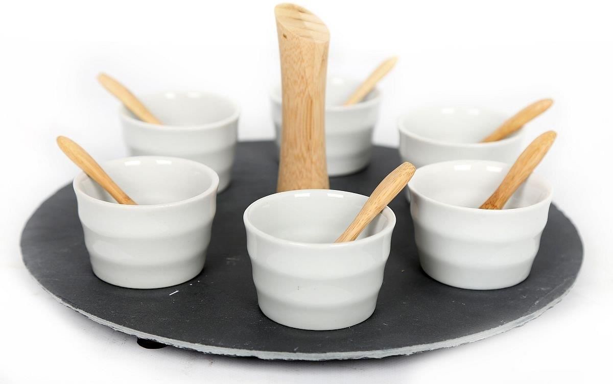 Zestaw do sosów/dipów z 6 miseczkami i łyżeczkami. Skład surowcowy: 60% kamień łupkowy, 20% porcelana, 10% drewno, 10% łyżeczki bambusowe. - wymiary w opakowaniu (głębokość x szerokość x wysokość): 31x30,9x6,4 cm - waga w opakowaniu: 203 g