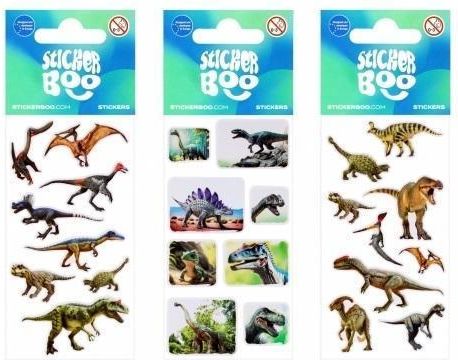 Miks wzorów, towar wysyłany losowo. Cena za sztukę. Naklejki STICKERBOO z grafiką z dinozaurami z pewnością przypadną do gustu dzieciakom, idealne do zdobienia rysunków, wszelkiego rodzaju prac plastycznych oraz kolekcjonowania. Dostępne w 3 odsłonach graficznych. Wymiary: 180x70 mm Opakowanie: blister