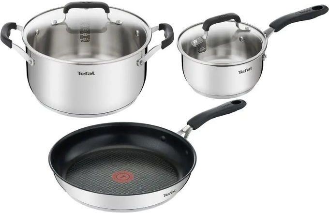 Tefal COOK&COOL G7155S14 Zalety Garnki Tefal Cook & Cool wykonano z solidnych wysokiej jakości materiałów, a jego funkcje zaprojektowano z myślą o maksymalnym bezpieczeństwie i wygodzie. Miękkie w dotyku uchwyty silikonowe nie nagrzewają się nawet przez kilka godzin użytkowania, natomiast bardzo wytrzymała stal nierdzewna zapewnia długotrwałą skuteczność. Właściwości wykonanie z najwyższej jakości stali nierdzewnej, odporne na korozję, uszkodzenia, wysoką temperaturę bardzo grube dno, odporne na deformację i gwarantujące równomierne rozprowadzenie ciepła nienagrzewające się, duże i wygodne uchwyty w pokrywach i garnkach zapewniają komfort gotowania i bezpieczeństwo użytkowania wewnątrz garnków znajduje się miarka, pozwalająca precyzyjnie odmierzać płyny zestaw jest przystosowany do użytku na wszystkich rodzajach kuchenek (ceramicznej, elektrycznej, gazowej i indukcyjnej) odpowietrznik zapewnia redukcję nadmiaru pary wodnej w garnku patelnia wyposażona w powłokę Titanium z Thermo-Spot - zmienia kolor na czerwony, gdy patelnia osiągnie idealną temperaturę gwarantującą doskonałe smażenie możliwość mycia w zmywarce ilość elementów: 5 szt. materiał: stal nierdzewna, silikon
