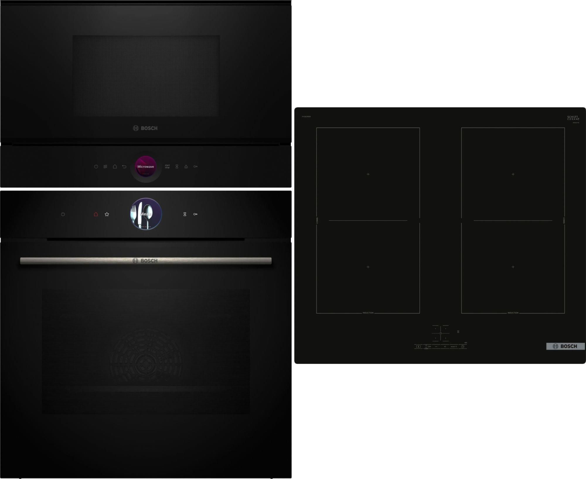 Bosch HBG7764B1 + BEL7321B1 + PVQ61RBB5E NAJWAŻNIEJSZE CECHY URZĄDZENIA Piekarnik elektryczny Bosch HBG7241B2 Najważniejsze parametry: Kolor: Czarny Wyświetlacz: dotykowy TFT TouchDisplay Cyfrowy Pierścień Sterujący Wnętrze piekarnika: emalia antracytowa GranitEmail Ilość rodzajów grzania: 14 Zakres temperatur (°C): 30-300 Prowadnice: drabinkowe Czyszczenie: parowe, emalia GranitEmail Pojemność wnętrza: 71 l Wymiary urządzenia (WxSxG): 595 mm x 594 mm x 548 mm Home Connect Ilość szyb w drzwiach: 3 szt. Kuchenka mikrofalowa Bosch BEL7321B1 Najważniejsze parametry: Kolor: Czarny Ilość poziomów mocy: 5 Wnętrze: stal szlachetna Sterowanie: sensorowe Pojemność: 21l Czyszczenue: parowe, sufit katalityczny Maksymalna moc mikrofal: 900 W Drzwi otwierane na lewo Oświetlenie: LED Wymiary urządzenia (WxSxG): 382 x 594 x 318 mm AutoPilot 10 Płyta indukcyjna Bosch PVQ61RBB5E Najważniejsze parametry: Typ: Płyta indukcyjna Ilość pól grzejnych: 4 2 strefy CombiZone 17 poziomów mocy TouchSelect: Steruj za pomocą przycisków dotykowych Licznik czasu gotowania PowerBoost: Zwiększenie mocy grzania Wskaźnik zalegania ciepła Wyłącznik główny: Wyłącza wszystkie strefy grzewcze za jednym dotknięciem Moc przyłączeniowa: 7400 W