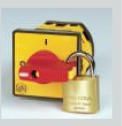 Żółta tabliczka 48x48 - czerwone pokrętło blokada na kłódkę montaż na panel. Pasuje do: P012-P020 C025-C040
