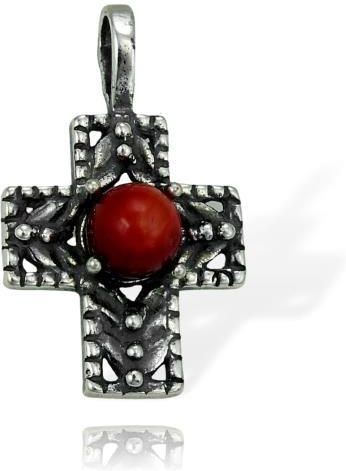 Norbisrebro Srebrny Ażurowy Oksdowany Mały Krzyż z Koralem Szczawnica