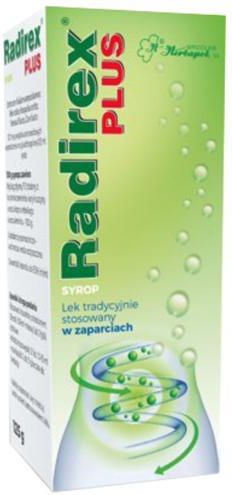 Ulotka dołączona do opakowania: informacja dla pacjenta To jest lek. Dla bezpieczeństwa stosuj go zgodnie z ulotką dołączoną do opakowania. Nie przekraczaj maksymalnej dawki leku. W przypadku wątpliwości skonsultuj się z lekarzem lub farmaceutą. Radirex PLUS syrop, 125g Extractum fluidum compositum ex: Rhei radice, Frangulae cortice, Foeniculi fructu, Carvi fructu 12,7 mg związków antranoidowych w przeliczeniuna glukofrangulinę A/15 ml syrop Należy uważnie zapoznać się z treścią ulotki przed zastosowaniem leku, ponieważ zawiera ona informacje ważne dla pacjenta. Lek ten należy zawsze stosować dokładnie tak, jak opisano w ulotce dla pacjenta, lub według zaleceń lekarza lub farmaceuty. - Należy zachować tę ulotkę, aby w razie potrzeby móc ją ponownie przeczytać. - Jeśli potrzebna jest rada lub dodatkowa informacja, należy zwrócić się do farmaceuty. - Jeśli u pacjenta wystąpią jakiekolwiek objawy niepożądane, w tym wszelkie możliwe objawy niepożądane niewymienione w ulotce, należy powiedzieć o tym lekarzowi lub farmaceucie. Patrz punkt 4. - Jeśli po upływie 1-2 tygodni nie nastąpiła poprawa lub pacjent czuje się gorzej, należy skontaktować się z lekarzem. 1. Co to jest lek Radirex PLUS i w jakim celu się go stosuje Syrop Radirex PLUS działa przeczyszczająco i jest stosowany na zasadzie tradycji w zaparciach. Zawarte w korze kruszyny i korzeniu rzewienia pochodne 1,8 dihydroantracenu wywierają wpływ na czynność motoryczną okrężnicy, przyspieszają pasaż jelitowy, zmniejszają resorpcję płynów. Działanie przeczyszczające występuje w 6-8 godz. po przyjęciu leku. Wskazania do stosowania Syrop Radirex PLUS jest lekiem tradycyjnie stosowanym w zaparciach. 2. Informacje ważne przed zastosowaniem leku Radirex PLUS Kiedy nie stosować leku Radirex PLUS - Jeśli pacjent ma uczulenie na substancję czynną lub którykolwiek z pozostałych składników tego leku (wymienionych w punkcie 6). - Nie stosować w przypadku niedrożności jelit, atonii jelit, ostrych i przewlekłych chorób zapalnych jelit (m.in. wrzodziejące zapalenie jelita grubego, choroba Leśniowskiego-Crohna), zapalenia wyrostka robaczkowego, biegunki, odwodnienia i zaburzeń elektrolitowych, w bólach brzucha o niejasnej etiologii. Ostrzeżenia i środki ostrożności Przed rozpoczęciem stosowania leku Radirex PLUS należy omówić to z lekarzem lub farmaceutą. Ze względu na zawartość 12,4 g sacharozy w jednej łyżce stołowej syropu, leku nie powinni stosować chorzy na cukrzycę. Jeśli stwierdzono wcześniej u pacjenta nietolerancję niektórych cukrów, pacjent powinien skontaktować się z lekarzem przed przyjęciem leku. W przypadku zastosowania u osób z chorobą hemoroidalną, szczelinami odbytu, po zabiegach operacyjnych okolic odbytu oraz w przypadku długotrwałego unieruchomienia zaleca się konsultację z lekarzem. Lek należy stosować w zaparciach wtedy, gdy zawodzi dieta i inne niefarmakologiczne sposoby leczenia. Nie należy stosować bez porady lekarza dłużej niż 1-2 tygodnie. Długotrwałe stosowanie produktu może doprowadzić do osłabienia perystaltyki jelit i do zakłócenia gospodarki wodno - elektrolitowej. Należy unikać stosowania leku podczas miesiączki. Produkt leczniczy zawiera do 3,5 % m/m etanolu (alkoholu), tzn. do 700 mg etanolu w jednej łyżce stołowej, co jest równoważne 14 ml piwa lub 6 ml wina. Dzieci i młodzież Nie zaleca się stosować u dzieci poniżej 12 lat. Lek Radirex PLUS a inne leki Należy powiedzieć lekarzowi o wszystkich lekach stosowanych przez pacjenta obecnie lub ostatnio, a także o lekach, które pacjent planuje stosować. Przy długotrwałym stosowaniu leku Radirex PLUS może się pojawić, wskutek niedoboru potasu, nasilenie działania glikozydów naparstnicy oraz leków przeciwarytmicznych. Straty potasu mogą się zwiększyć przy równoczesnym przyjmowaniu leków moczopędnych, steroidów kory nadnerczy i korzenia lukrecji. Ciąża, karmienie piersią i wpływ na płodność Jeśli pacjentka jest w ciąży lub karmi piersią, przypuszcza, że może być w ciąży lub gdy planuje mieć dziecko, powinna poradzić się lekarza lub farmaceuty przed zastosowaniem tego leku. Leku nie należy stosować w czasie ciąży i karmienia piersią. Wpływ na płodność nie jest znany. Prowadzenie pojazdów i obsługiwanie maszyn Brak danych na temat wpływu na zdolność prowadzenia pojazdów i obsługiwania maszyn. 3. Jak stosować lek Radirex PLUS Ten lek należy zawsze stosować dokładnie tak, jak opisano w ulotce dla pacjenta lub według zaleceń lekarza lub farmaceuty. W razie wątpliwości należy zwrócić się do lekarza lub farmaceuty. Stosować doustnie, przed snem. Do opakowania dołączona jest miarka ułatwiająca dawkowanie. Dorośli: 30 ml miarką lub 2 łyżki stołowe, tj. 25,4 mg związków antranoidowych w przeliczeniu na glukofrangulinę A. Młodzież powyżej 12 lat: 10-15 ml miarką lub 2 do 3 łyżeczek do herbaty, tj. od 8,5 do 12,7 mg związków antranoidowych w przeliczeniu na glukofrangulinę A. Zastosowanie większej niż zalecana dawki leku Radirex PLUS Podczas stosowania produktu Radirex PLUS nie zaobserwowano dotychczas objawów przedawkowania. W razie przyjęcia większej niż zalecana dawki leku, należy niezwłocznie zwrócić się do lekarza lub farmaceuty. Pominięcie zastosowania leku Radirex PLUS Nie należy stosować dawki podwójnej w celu uzupełnienia pominiętej dawki. Przerwanie stosowania leku Radirex PLUS W razie jakichkolwiek dalszych wątpliwości związanych ze stosowaniem tego leku, należy zwrócić się do lekarza lub farmaceuty. 4. Możliwe działania niepożądane Jak każdy lek, lek ten może powodować działania niepożądane, chociaż nie u każdego one wystąpią. Możliwe działania niepożądane leku przedstawiono zgodnie z klasyfikacją narządów i układów wg MedDRA oraz częstością występowania: bardzo często (>1/10); często (