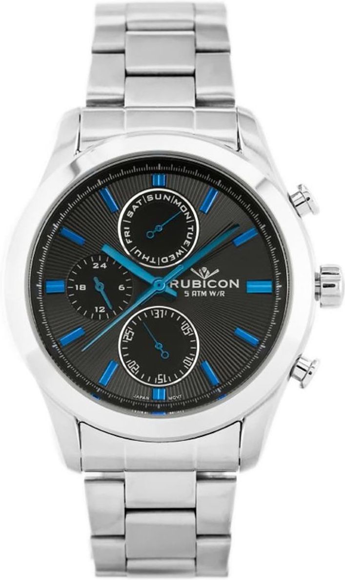 ZEGAREK MĘSKI RUBICON RNDE03 (zr086b) OPIS Mechanizm: MIYOTA Koperta i bransoleta ze stali szlachetnej Wskazanie 24-godzinne Datownik - dzień miesiąca i tygodnia Wodoszczelność klasy WR50 WYMIARY koperta: 43 x 52 x 11mm średnica tarczy: 36mm szerokość bransoletki: 22/20 mm maksymalny obwód wewnętrzny: ok. 20,5cm KOLORYSTYKA tarcza: czarna indeks: niebieski bransoleta: srebrna koperta: srebrna ring: srebrny Gwarancja producenta: 24m-ce Inny kolor? Szukaj w naszym sklepie: zr086 Kolor paska/bransolety: Srebrny Kształt tarczy: Okrągły Mechanizm: Kwarcowy Pasek/bransoleta: Stal szlachetna Rodzaj tarczy: Wskazówkowa Klasa wodoszczelności: WR50 Szkło: Mineralne Kolor tarczy: Czarny Funkcje: Mineralne szkło, Antyalergiczna powłoka, Stal nierdzewna, Powłoka IPS, Datownik, Wodoszczelność 50M Gotowy do wystawienia: Tak Płeć: Męskie Długość towaru w centymetrach: 25 Szerokość towaru w centymetrach: 8 Wysokość towaru w centymetrach: 5 Waga gabarytowa w gramach: 166.67 Kolor koperty: Srebrny Konfigurator usługi grawerowania: true Kod producenta: 5906412734531